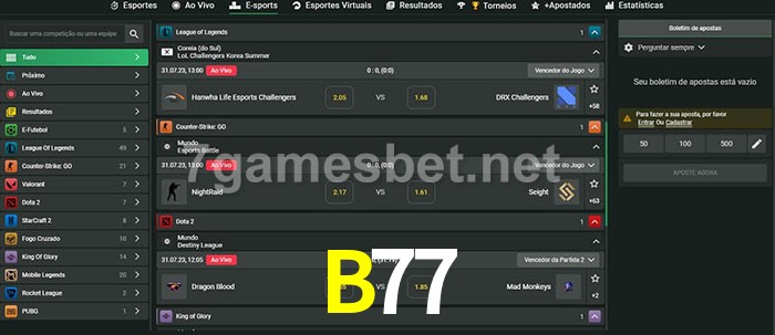 O B77 oferece uma grande seleção de opções de apostas em e-sports com probabilidades competitivas